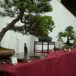 Bij aankomst blijkt de show in een wijkcentrum te zijn. Echter, een wijkcentum met een geweldige overdekte buitenplaats, welke normaal gesproken dienst lijkt te doen als terras. De tafeltjes met stoelen staan er deels nog. En rondom het terras zijn wanden bespannen met wit doek geplaatst, met hiervoor een lange tafel met een bordeaux kleurig kleed er over. Een mooie combinatie. Hierdoor ontstaat een gezellige zithoek, omgeven door bonsai. Dankzij de overkapping stond alles mooi drooog, en toch in de frisse buitenlucht.