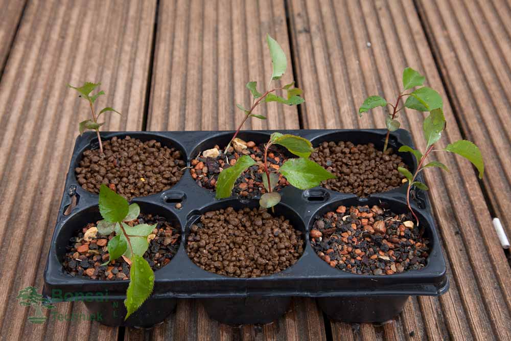 Voor dit experiment heb ik 6 malus zaailingen gebruikt. In het vroege voorjaar, enkele weken na het opkomen heb ik de zaailingen uit de zaaitray gehaald en op grootte gesorteerd. Vervolgens heb ik een kleine, een middelgrote en een grote zaailing in de groep Akadama, en een van elk in de groep regulier substraat ingedeeld. De wortels heb op op gelijke lengte ingekort. Daarna zijn de zaailingen in een 6-pot tray geplant, afwisselend voor en achter -zie foto-. Op deze manier zijn de planten allemaal ongeveer aan dezelfde omstandigheden blootgesteld.  De potten zijn vervolgens in de volle zon gezet, en gedurende het groeiseizoen omgedraaid. Gieten en bemesten is voor alle planten op dezelfde manier gedaan, gewoon, zoals al mijn planten water en mest gekregen hebben.